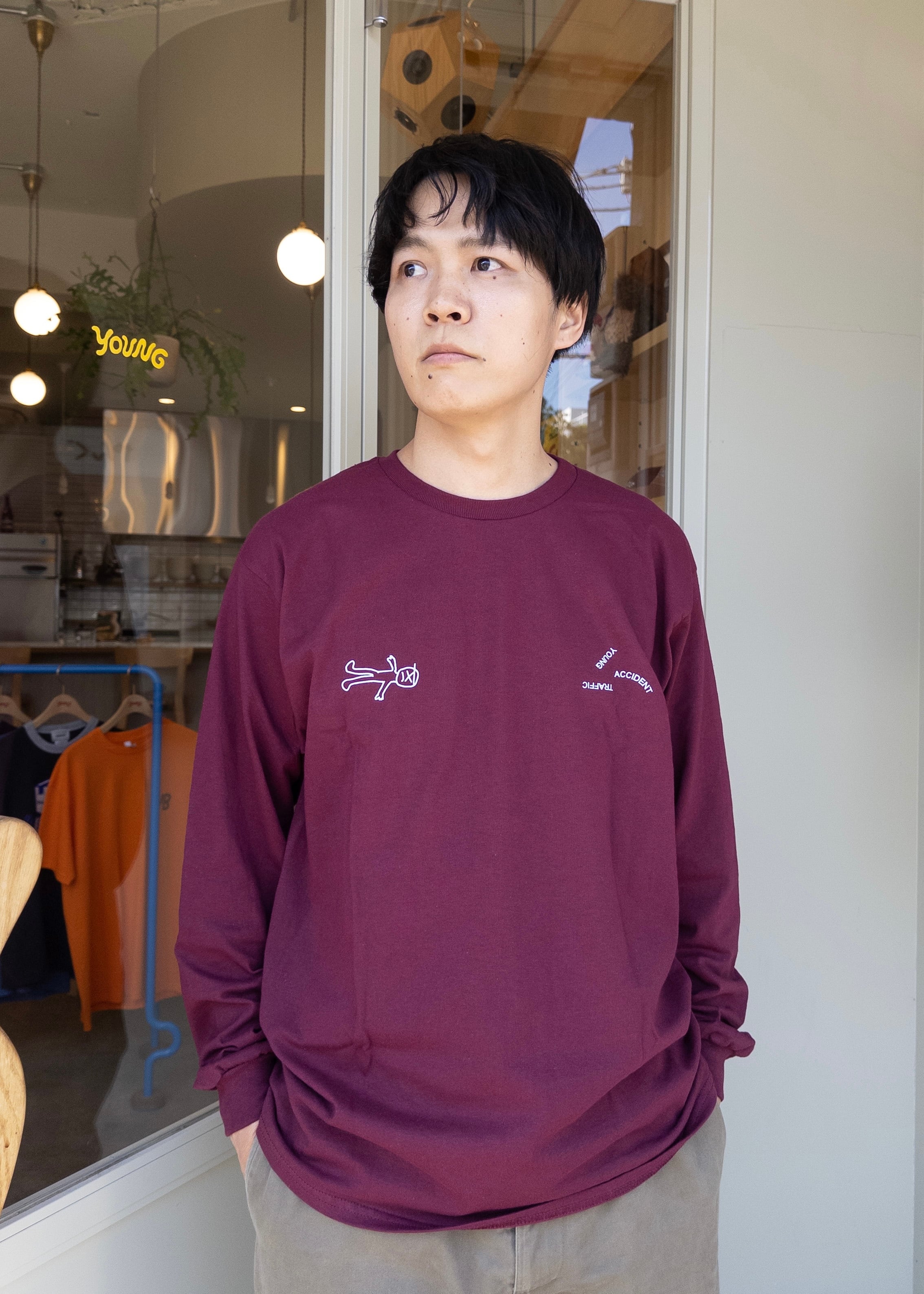 店主が車にひかれた記念でつくった交通安全的アパレルのロンTバージョン。